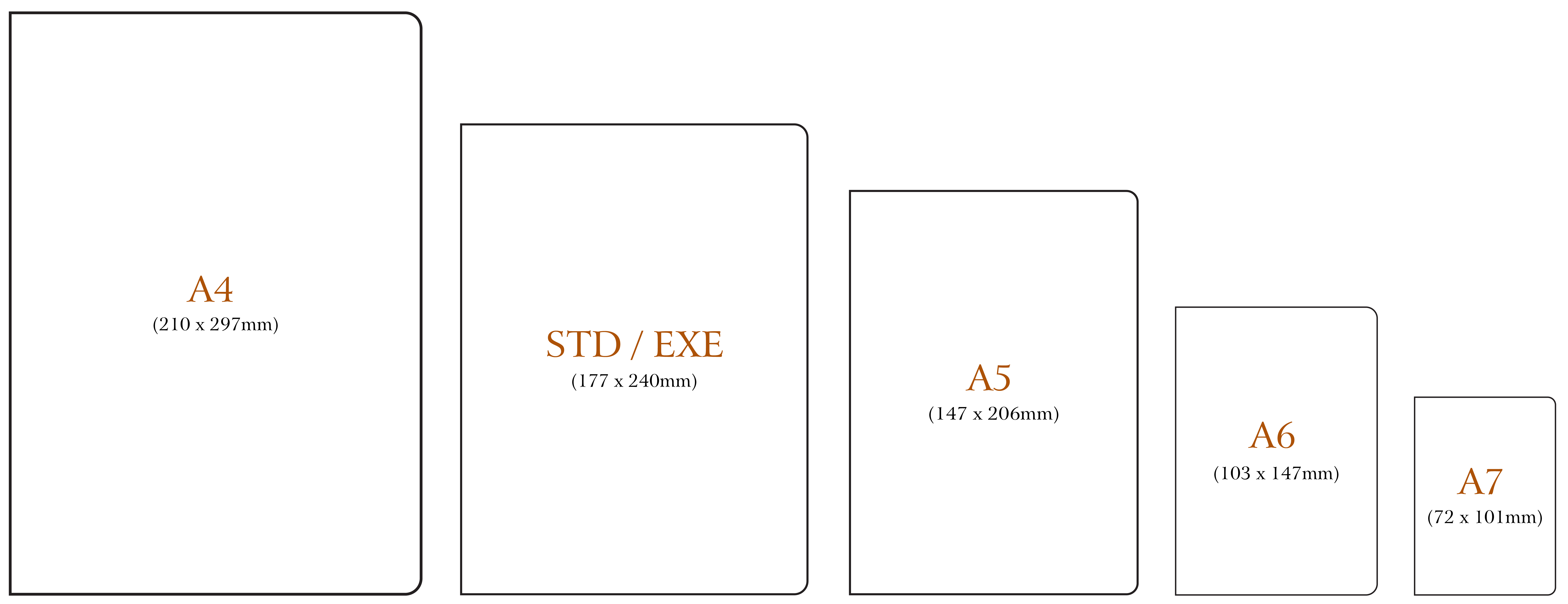 The Nightingale Notebooks offers a variety of notebook sizes to fit your needs. Our sizes include A4,STD, A5, A6, and A7 size, so you can choose the perfect notebook for your project, whether it's for school, work, or personal use. A4 & STD size is perfect for larger projects that require ample space, while A5 size is great for taking notes on the go. A6 size is compact and perfect for quick notes and memos, while A7 size is a classic choice that fits easily into most bags or purses. Our size chart makes it easy to select the right notebook for your needs, so you can focus on the content without worrying about the format.